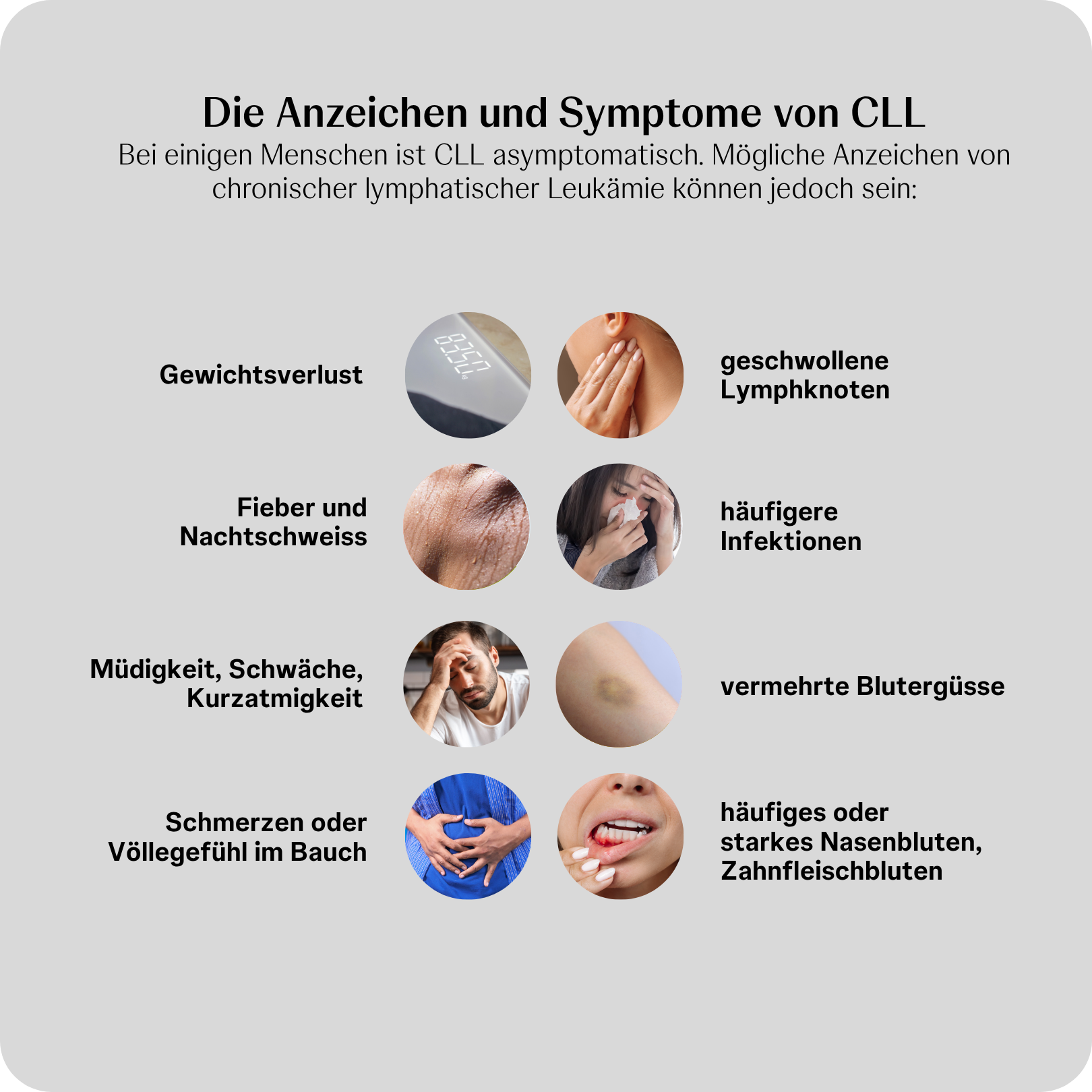 Die häufigsten Symptome der CLL, einer chronischen (Form der) Leukämie, sind:
