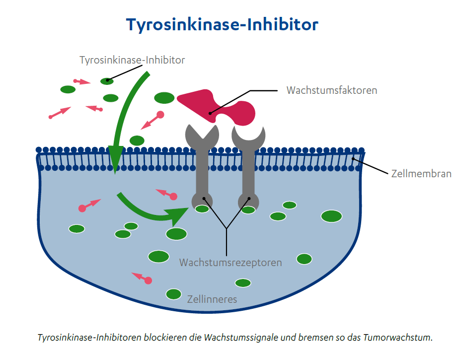 Wie genau wirken Tyrosinkinase-Inhibitoren? Um sich zu teilen, brauchen Zellen ein Signal. Dieses Wachstumssignal nehmen sie in der Regel von aussen über Andockstellen (Rezeptoren) auf. Die Rezeptoren leiten das Signal in das Innere der Zellen weiter und lösen dort die Zellteilung aus (1). Für die Signalweiterleitung im Zellinneren sind unter anderem bestimmte Moleküle, sogenannte Tyrosinkinasen, verantwortlich. Das können Sie sich wie einen Telefonanruf vorstellen: Jedes Mal, wenn ein Anruf von aussen mit dem Signal „Zellteilung“ kommt, gibt der Empfänger – die Tyrosinkinase – des Anrufs die Nachricht weiter und die Zelle teilt sich. Sind die Tyrosinkinasen dauerhaft aktiviert, bekommen die Zellen ständig das Signal zur Zellteilung – es bilden sich immer mehr Krebszellen und der Tumor wächst.25 Tyrosinkinase-Inhibitoren sind Arzneistoffe, die so klein sind, dass sie ins Innere der Zellen gelangen. Dort setzen sie sich gezielt auf die Tyrosinkinasen und blockieren sie. Sie verhindern also, dass der Empfänger die Nachricht weitergibt (2). Die Tyrosinkinasen können keine Wachstumssignale mehr weiterleiten und die Krebszellen teilen sich nicht mehr und sterben ab.